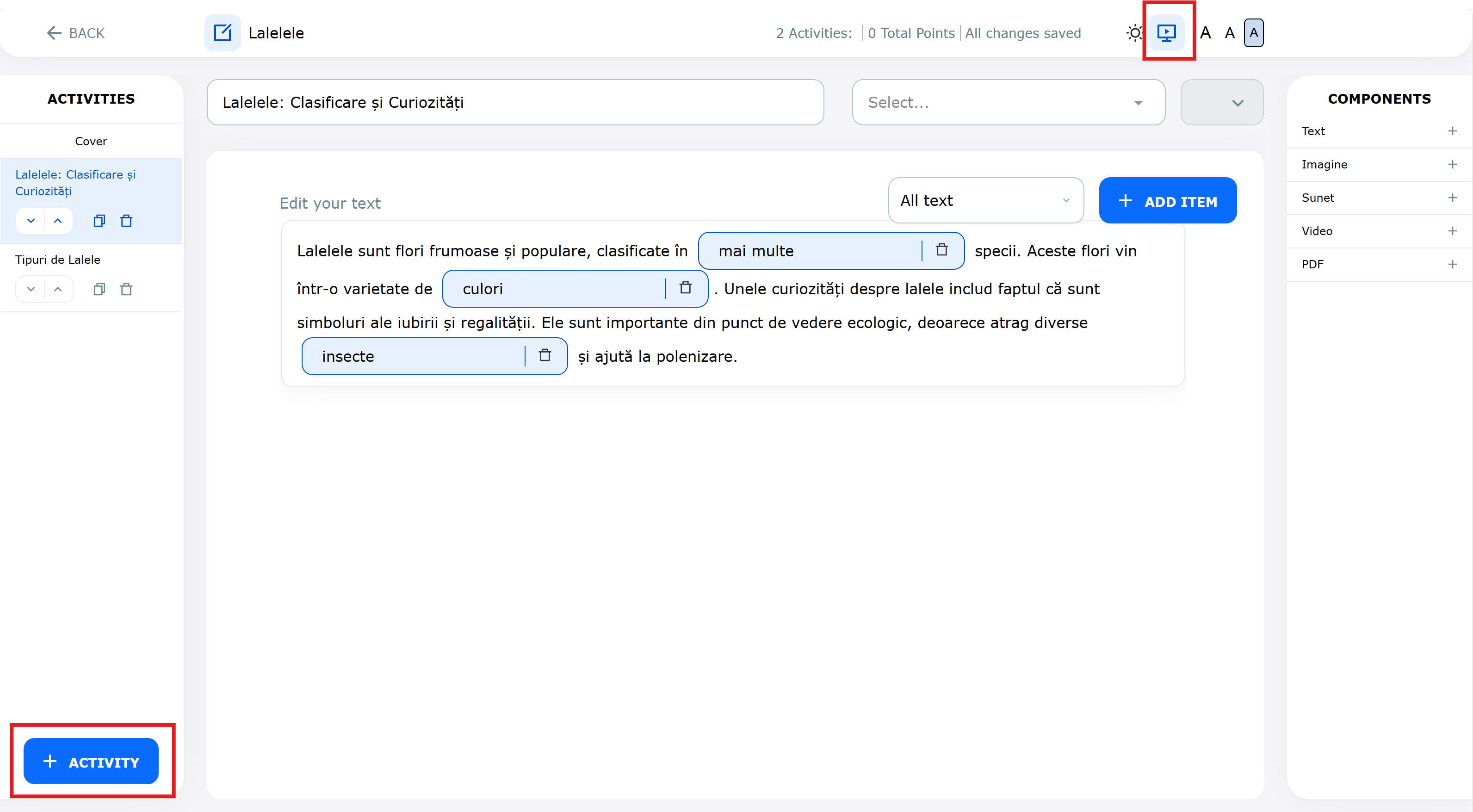 Adaugă activități interactive precum întrebări cu alegere multiplă, exerciții de potrivire sau completare a spațiilor libere.